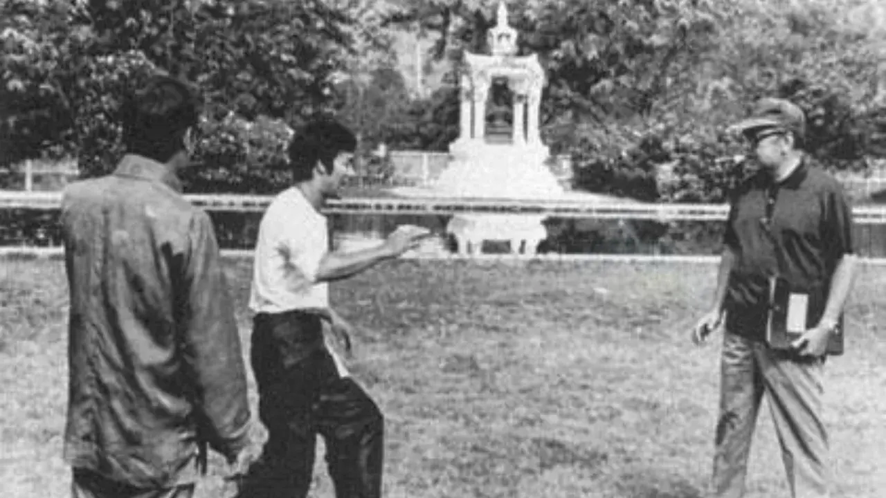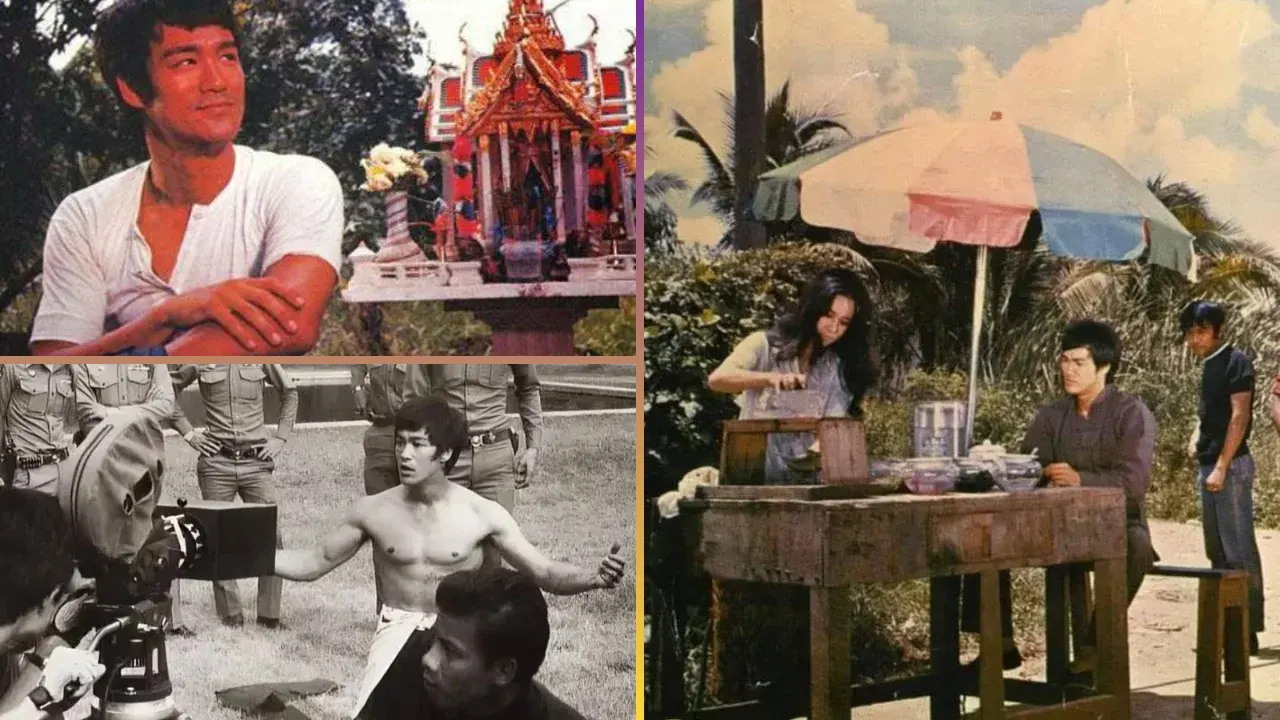 ภาพเบื้องหลัง: ปรากฏภาพบรูซ ลี ในขณะพักกองถ่าย ซึ่งแสดงให้เห็นบรรยากาศการทำงานร่วมกับทีมงานและนักแสดงสมทบที่แต่งกายในชุดตำรวจไทยยุคเก่า