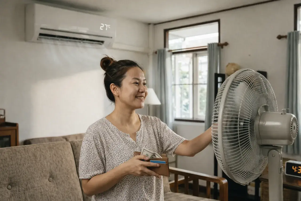เทคนิคง่าย ๆ : ลองตั้งแอร์ไว้ที่ 26 หรือ 27 องศาดูค่ะ 'แล้วเปิดพัดลมจ่อมาที่ตัวเราโดยตรง' เชื่อไหมคะว่าพัดลมจะช่วยดึงลมเย็นให้หมุนเวียนและสัมผัสผิวเรา ทำให้เรารู้สึกเย็นฉ่ำเหมือนเปิดแอร์ 24 องศาเลยล่ะค่ะ แต่โดยทั่วไปวิธีนี้ช่วยประหยัดไฟได้ประมาณ 10–15% เลยค่ะ ลองดูค่ะ เงินเหลือเอาไปซื้อก๋วยเตี๋ยวอร่อย ๆ ได้หลายมื้อเลยนะ!