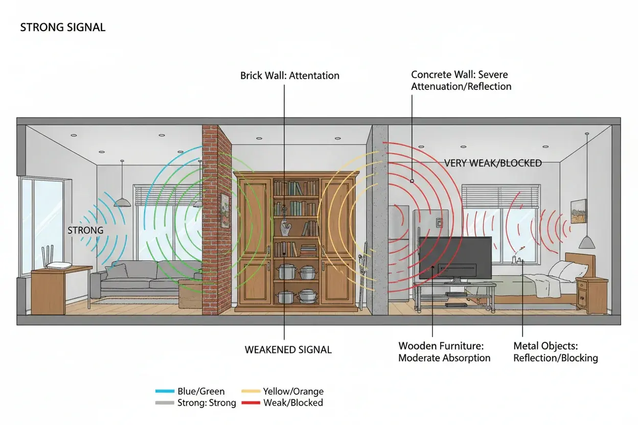 สาเหตุถัดมาคือ สิ่งกีดขวางในบ้าน โดยเฉพาะผนังคอนกรีต เสา คาน กระจกบานใหญ่ ตู้เหล็ก ตู้เย็น หรือแม้แต่ตู้ปลาขนาดใหญ่ วัสดุเหล่านี้สามารถดูดซับหรือสะท้อนคลื่นได้ดี ทำให้สัญญาณอ่อนลงอย่างเห็นได้ชัด CenturyLink ระบุว่าผนังอิฐ ผนังคอนกรีต และเครื่องใช้ไฟฟ้าขนาดใหญ่ล้วนกระทบต่อสัญญาณ ส่วนภาพประกอบด้านการวางเครือข่ายในบ้านก็ชี้ให้เห็นว่าเมื่อมีผนังหนาหรือของโลหะขวางอยู่ คุณภาพสัญญาณในบางห้องจะตกลงอย่างเป็นพื้นที่ ไม่ได้ค่อย ๆ ลดแบบเส้นตรงเสมอไป
