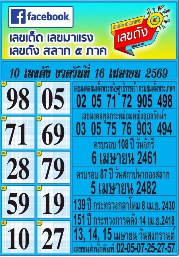 10 เลขดังสลาก 5 ภาค งวด 16 เม.ย. 2569 รวมเลขเด่นครบ