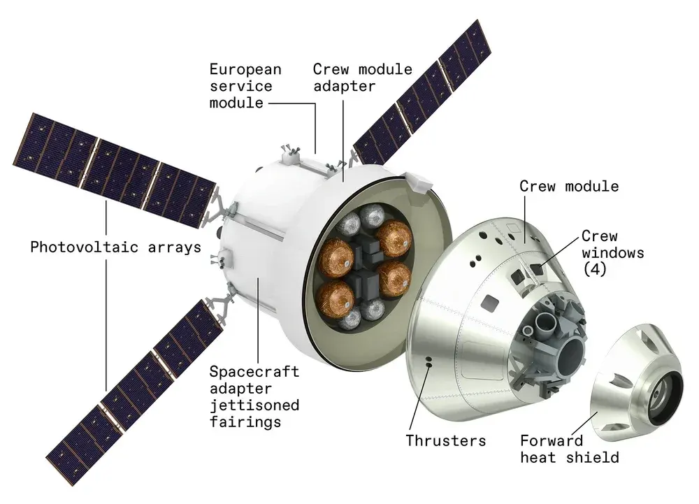 โครงสร้างของโอไรออนถูกแบ่งออกเป็นสองส่วนหลักที่ทำงานประสานกันอย่างลงตัว ด้านบนคือโมดูลลูกเรือซึ่งมีรูปทรงกรวย ออกแบบให้รองรับนักบินอวกาศทั้งสี่—Reid Wiseman, Victor Glover, Christina Koch และ Jeremy Hansen—ให้สามารถใช้ชีวิตและปฏิบัติงานได้อย่างมีประสิทธิภาพตลอดภารกิจ พื้นที่ภายในกว้างขวางกว่ายานอพอลโลในอดีตอย่างชัดเจน พร้อมระบบควบคุมแบบดิจิทัลเต็มรูปแบบที่เรียกว่า Glass Cockpit ซึ่งลดความซับซ้อนของแผงสวิตช์แบบเดิม เหลือเพียงหน้าจอแสดงผลหลักและอินเทอร์เฟซที่ตอบสนองได้อย่างแม่นยำ