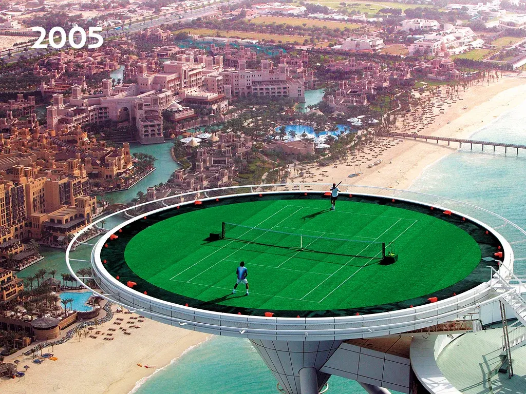 ช่วงเวลาที่ทำให้สนามแห่งนี้กลายเป็นตำนาน เกิดขึ้นเมื่อวันที่ 22 กุมภาพันธ์ 2005 เพื่อโปรโมตการแข่งขัน Dubai Duty Free Tennis Championships เมื่อพื้น Helipad ถูกเนรมิตให้กลายเป็นสนามหญ้าเทียมสีเขียวสด และสองตำนานอย่าง Roger Federer และ Andre Agassi ได้ขึ้นมาดวลกันบนพื้นที่แคบกลางเวหา