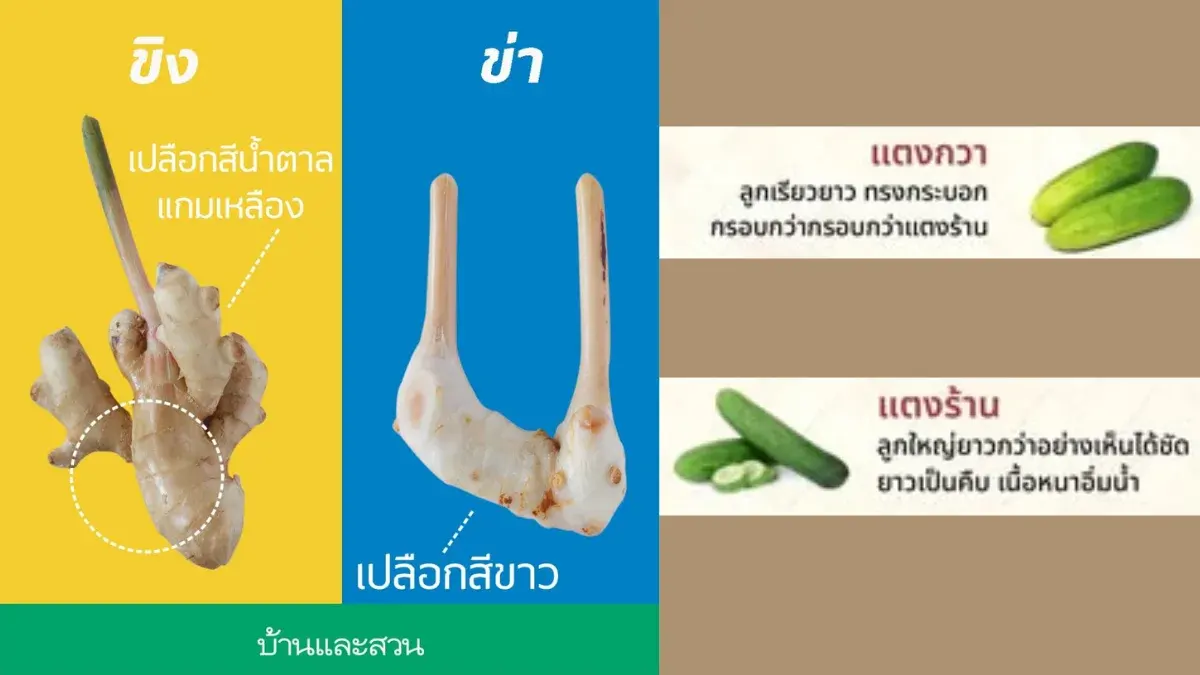 - ขิง หัวและแง่งเล็กกว่า เปลือกสีน้ำตาลแกมเหลือง เนื้อในสีเหลืองเข้มกว่า มีปล้องชัดเจน