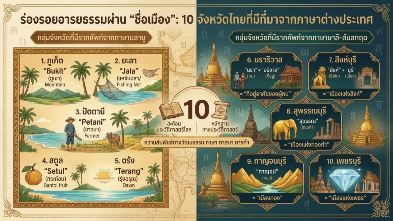 ประเทศไทยเป็นดินแดนที่มีความหลากหลายทางวัฒนธรรมมาช้านาน ซึ่งหลักฐานที่ชัดเจนที่สุดอย่างหนึ่งซ่อนอยู่ใน "ชื่อจังหวัด" ทั้ง 77 แห่ง แม้เราจะคุ้นเคยกับการเรียกชื่อเหล่านี้จนดูเป็นไทยแท้ แต่แท้จริงแล้วมีหลายจังหวัดที่มีรากศัพท์มาจากภาษาต่างประเทศ ไม่ว่าจะเป็นภาษามลายูที่สะท้อนวิถีชีวิตชาวเล หรือภาษาบาลี-สันสกฤตที่สื่อถึงความรุ่งเรืองของศาสนาและอำนาจในอดีต การทำความเข้าใจที่มาของชื่อเหล่านี้จึงเปรียบเสมือนการย้อนเวลากลับไปสำรวจประวัติศาสตร์การติดต่อค้าขายและการหลอมรวมทางวัฒนธรรมของไทย