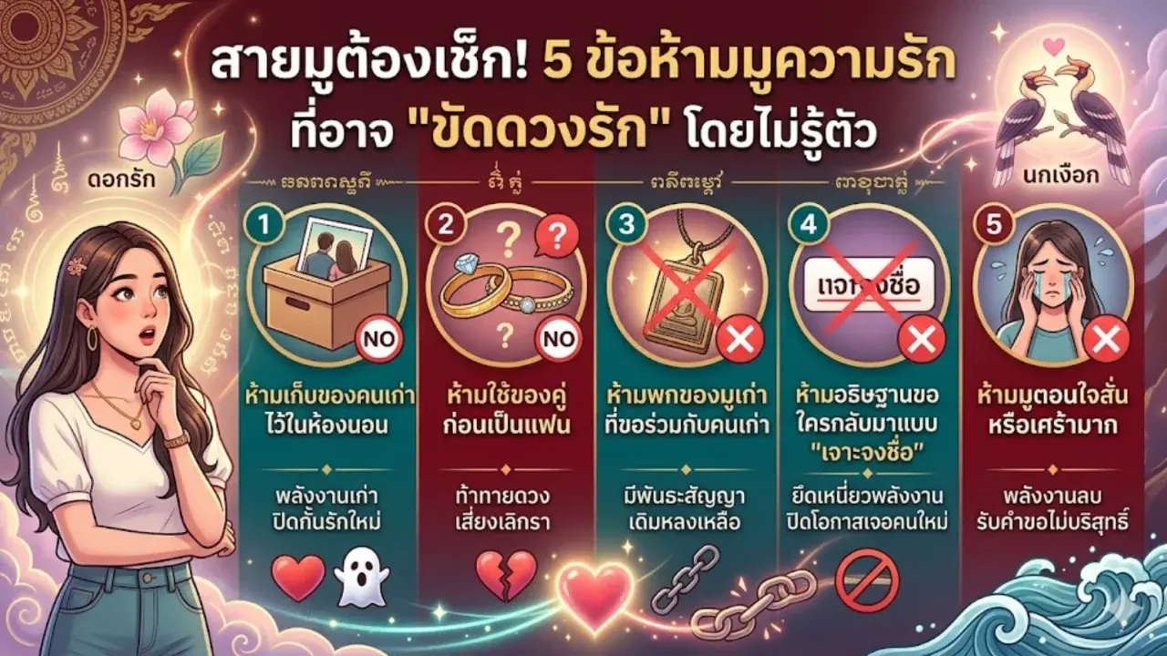 การมูเตลูเพื่อขอให้สมหวังในความรักเป็นที่นิยมอย่างมากในปัจจุบัน แต่หลายคนอาจสงสัยว่าทำไมมูเท่าไหร่ก็ไม่เห็นผล หรือทำไมความรักถึงยังมีอุปสรรคอยู่บ่อยครั้ง ความจริงแล้วอาจเป็นเพราะคุณกำลังเผลอทำพฤติกรรมบางอย่างที่กลายเป็นการ "ปิดกั้นพลังงาน" หรือขัดขวางดวงชะตาของตัวเองโดยไม่รู้ตัว หากอยากให้การมูครั้งต่อไปสัมฤทธิ์ผลและได้เจอกับความรักที่ดี ลองตรวจสอบ 5 ข้อห้ามสำคัญที่สายมูความรักไม่ควรทำเด็ดขาด