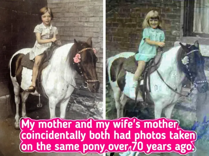 1. ให้บังเอิญว่าทั้งแม่ของผมและแม่ของภรรยาผมต่างก็เคยไปถ่ายรูปกับม้าตัวเดียวกันเมื่อกว่า 70 ปีที่แล้วในมอนทรีออล