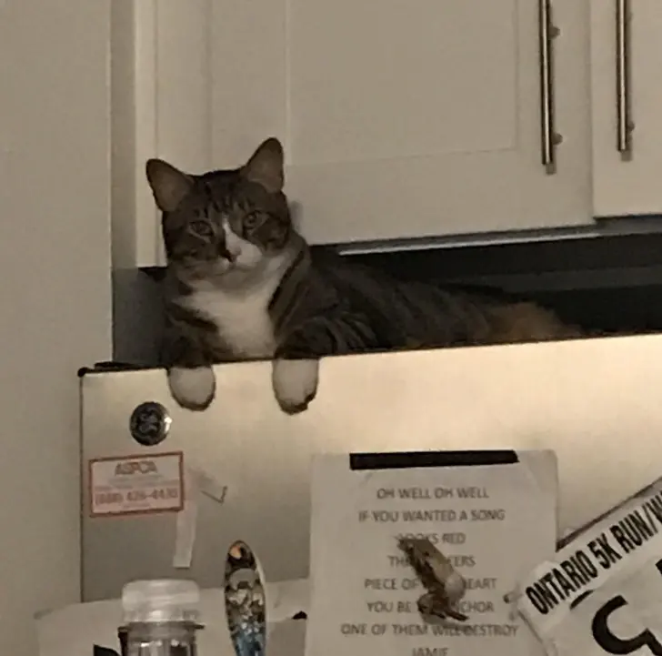 5. ลายสีตัดบนอุ้งเท้าของเจ้าแมวของฉันวางตัวได้พอดีกับขอบด้านบนของตู้เย็นเลย