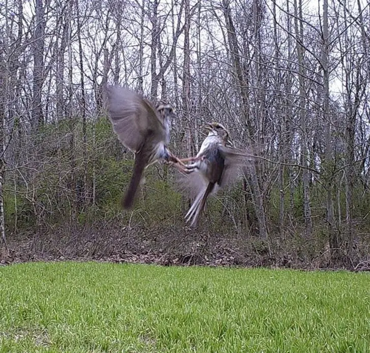 9. กล้องดักถ่ายภาพของผมจับภาพในช่วงเวลาที่นกสองตัวนี้บินมาเจอกันกลางอากาศได้แบบพอดี