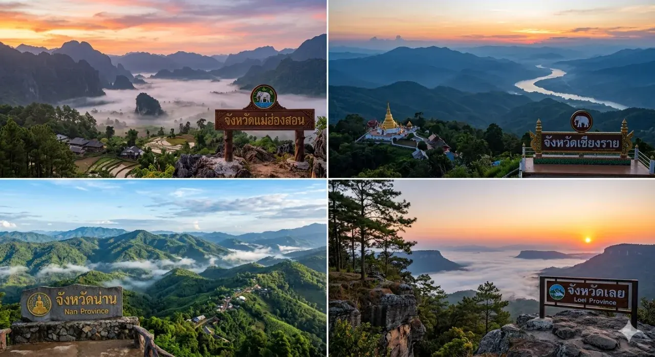 จังหวัดแม่ฮ่องสอน: ได้ชื่อว่าเป็น "เมืองสามหมอก" พื้นที่เกือบทั้งหมดเป็นภูเขาสูงชันและป่าไม้ ตัวเมืองตั้งอยู่ในหุบเขาที่ล้อมรอบด้วยเทือกเขาถนนธงชัย ทำให้มีความเป็นธรรมชาติสูงและอากาศเย็นสบายเกือบตลอดปี