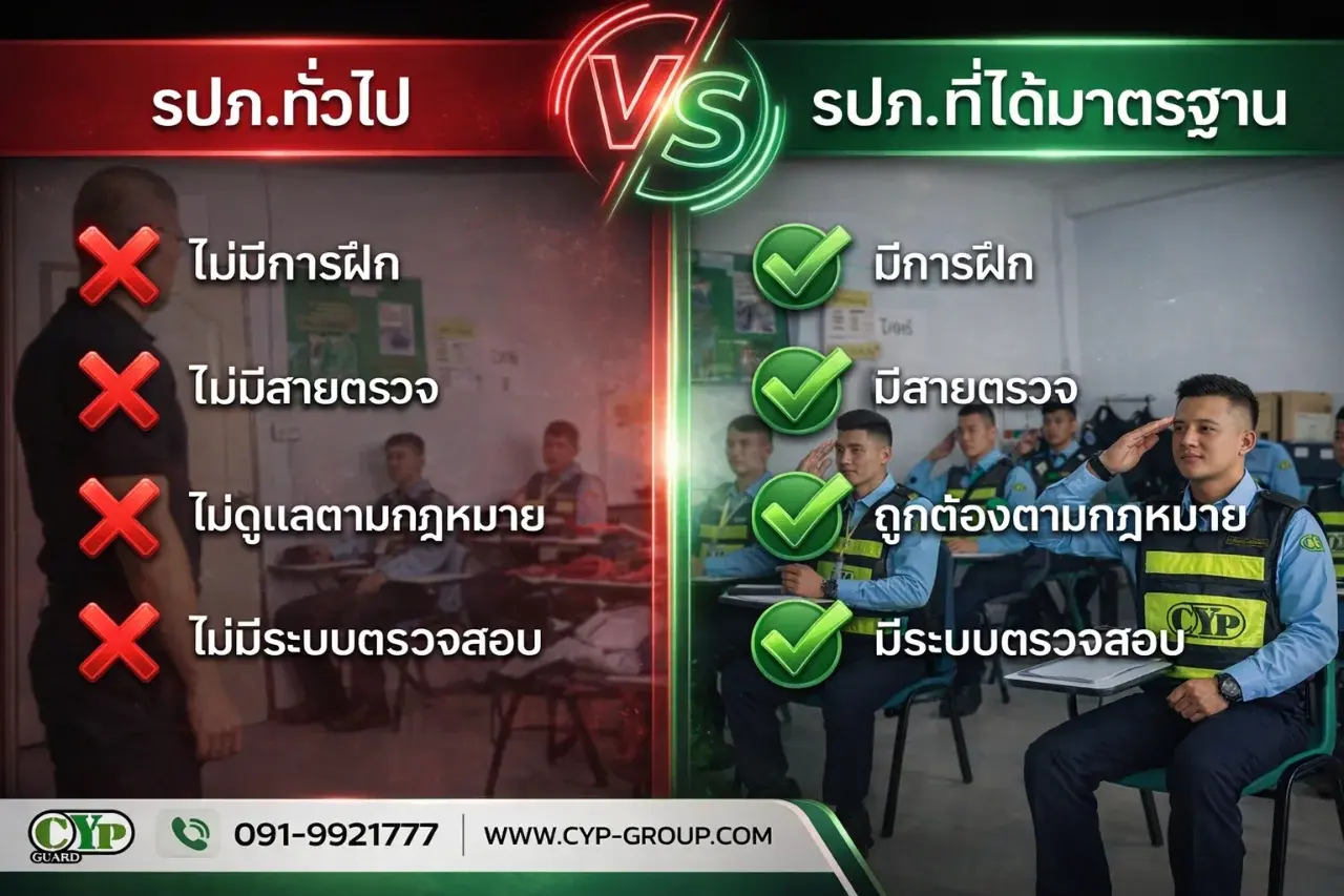 ในทางกลับกัน รปภ.ที่ได้มาตรฐาน อย่าง CYP GUARD ให้ความสำคัญตั้งแต่ “ต้นน้ำถึงปลายน้ำ” เริ่มจากการฝึกอบรมพนักงานอย่างเข้มงวด ทั้งด้านวินัย การสังเกตการณ์ การควบคุมสถานการณ์ และการให้บริการลูกค้า เพื่อให้สามารถปฏิบัติงานได้อย่างมืออาชีพในทุกสถานการณ์