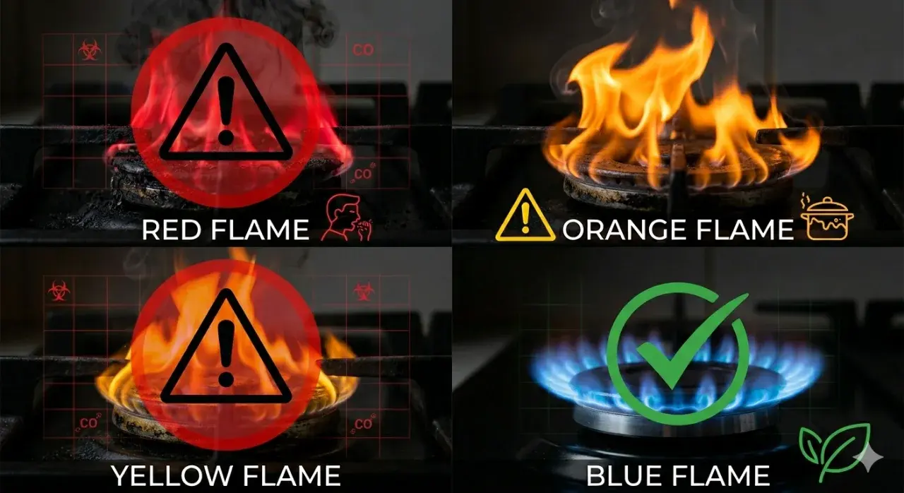 สีของเปลวไฟเตาแก๊สบ่งบอกประสิทธิภาพการเผาไหม้และความปลอดภัย โดยสีน้ำเงิน/ฟ้าครามร้อนที่สุด แสดงถึงการเผาไหม้สมบูรณ์และประหยัดแก๊ส ส่วนสีเหลืองหรือแดงเป็นสัญญาณอันตรายเผาไหม้ไม่สมบูรณ์ ทำให้ก้นหม้อดำและเกิดก๊าซพิษ ควรทำความสะอาดหัวเตาเมื่อไฟผิดปกติ