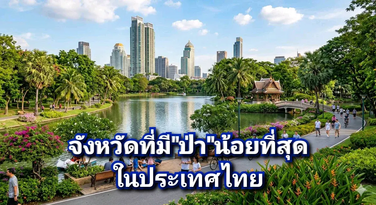 เมื่อพิจารณาจากโครงสร้างการใช้ที่ดินและลักษณะภูมิประเทศโดยรวม จังหวัดที่มีพื้นที่ป่าน้อยที่สุดในประเทศไทยอย่างชัดเจนคือ “กรุงเทพมหานคร” ซึ่งมีลักษณะเป็นมหานครขนาดใหญ่ที่ถูกพัฒนาอย่างเข้มข้นจนแทบไม่หลงเหลือพื้นที่ป่าธรรมชาติ