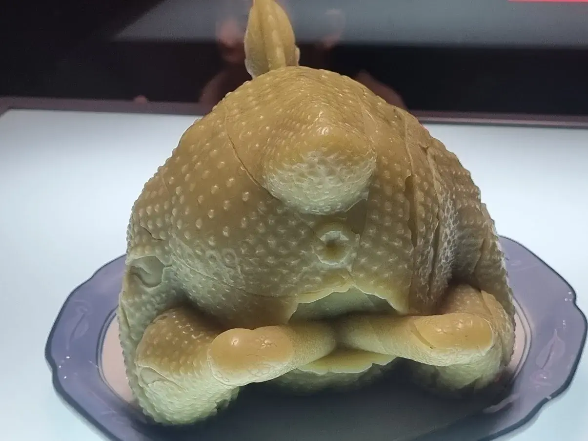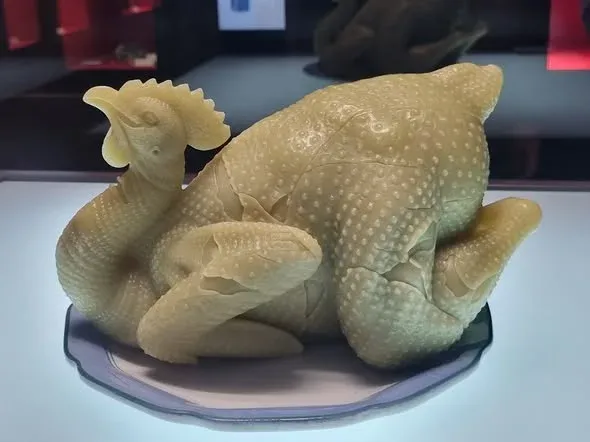 นี่คืองานศิลปะชื่อไก่ต้มขาวแล่เนื้อ (白切鸡) ที่พิพิธภัณฑสถานมณฑลกวางตุ้ง ทำออกมาเหมือนมากๆ จนะน่ากินตามสไตล์อาหารกวางตุ้ง แต่กินไม่ได้ เพราะสลักจากหินขี้ผึ้งเหลืองหรือ "หยกกว่างหนิง" (广宁玉) นับเป็นงานศิลปะชิ้นเอกของพิพิธภัณฑ์สถานแห่งนี้ มีคนไปดูเยอะมากที่สุดเลยเด้อครับเด้อ