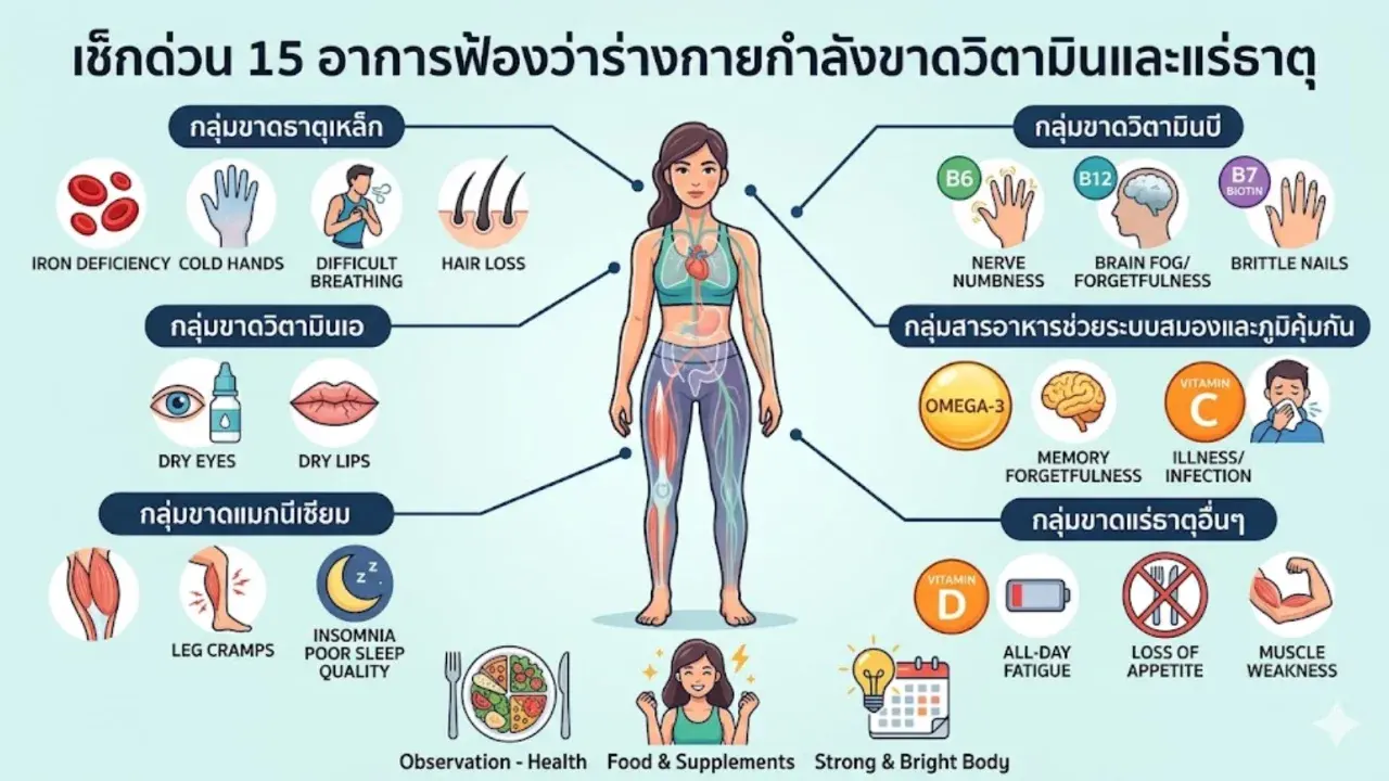 สัญญาณเตือนจากร่างกายอาจเป็นเสียงสะท้อนที่บ่งบอกว่าเรากำลังละเลยการดูแลตัวเอง โดยเฉพาะการขาดสารอาหารและวิตามินที่จำเป็นต่อระบบต่างๆ ซึ่งมักจะแสดงออกมาผ่านอาการเล็กๆ น้อยๆ ในชีวิตประจำวัน หากเราหันมาสังเกตและเติมเต็มสิ่งที่ขาดไป ก็จะช่วยให้สุขภาพกลับมาแข็งแรงและสมดุลได้อีกครั้ง