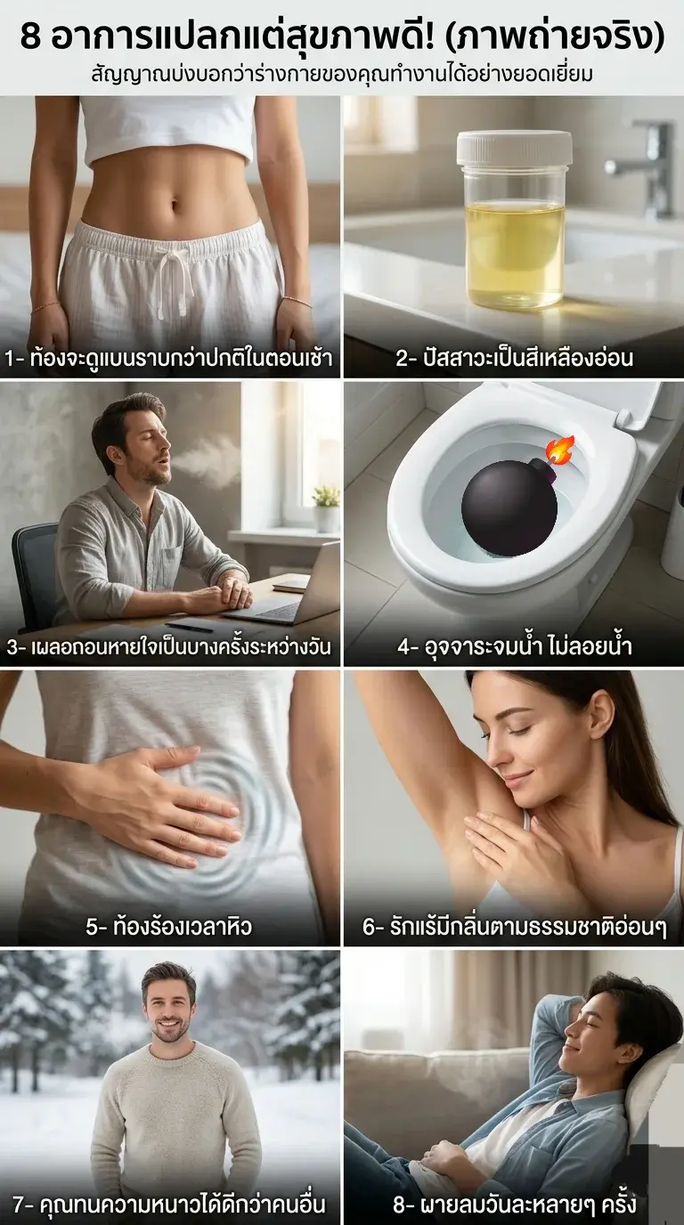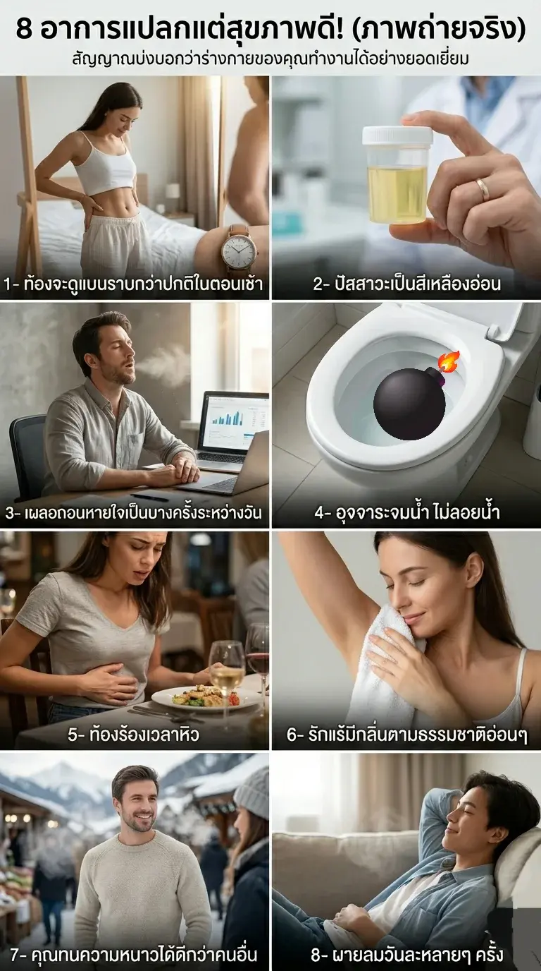 แต่รู้หรือไม่ครับว่า... บางอาการที่เรามองว่าน่ารำคาญ น่าอาย หรือดูแปลกๆ จริงๆ แล้วมันคือ "สัญญาณเตือนความสมบูรณ์แบบ" ของระบบในร่างกายเราต่างหาก! วันนี้ผมเลยขอรวบรวม 8 อาการแปลกๆ ที่คอนเฟิร์มตามหลักวิทยาศาสตร์เลยว่า ถ้าคุณมีอาการเหล่านี้ สบายใจได้เลยครับ ร่างกายคุณกำลังฟิตและแฮปปี้สุดๆ! มาลองเช็คลิสต์กันดูครับว่าคุณมีกี่ข้อ
