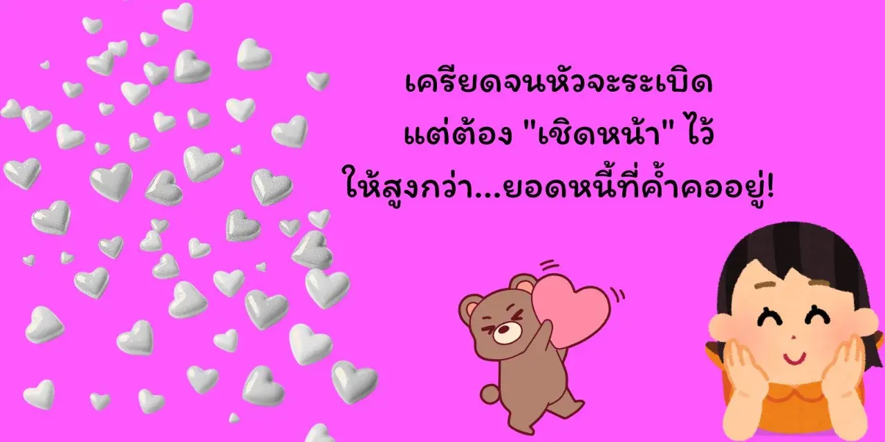 ท่ามกลางความทุกข์ใจ เราเลือกที่จะเล่นคำเปรียบเทียบที่เห็นภาพชัดเจนระหว่าง "การเชิดหน้า" กับ "ยอดหนี้" เพื่อประชดว่าต่อให้ภาระจะหนักหนาแค่ไหน เราก็ต้องยกหน้าให้สูงกว่านั้นเข้าไว้ เป็นการขยี้ใจคนสู้ชีวิตที่ต้องหยิ่งในศักดิ์ศรีแม้ในวันที่กระเป๋าแห้ง
