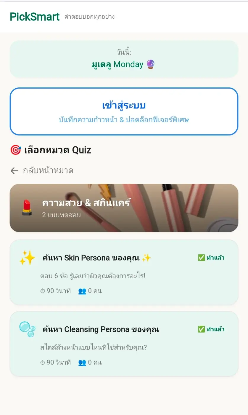เมื่อวานเลื่อนฟีดไปเจอเว็บชื่อ PickSmart เข้าไปลองเล่น Quiz "ค้นหา Skin Persona ของคุณ" ตอบ 6 ข้อจบ