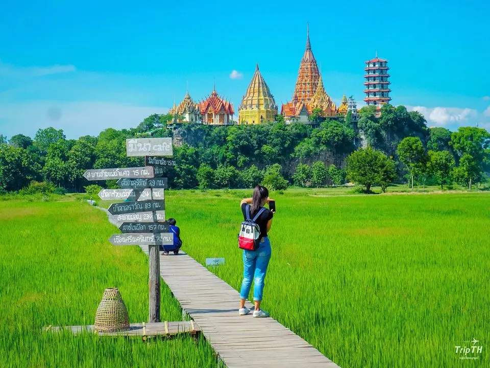 ขยับมาที่ จังหวัดกาญจนบุรี ที่โดดเด่นมากในเรื่อง คาเฟ่กลางทุ่งนาและริมน้ำ ใครที่ชอบฟีลธรรมชาติเขียวขจี มีฉากหลังเป็นภูเขาหรือต้นจามจุรียักษ์ กาญจนบุรีคือคำตอบที่ใช่ที่สุด เพราะที่นี่เน้นร้านขนาดใหญ่ที่มีพื้นที่กว้างขวางให้ความรู้สึกผ่อนคลายและได้รูปมุมกว้างที่ดูอลังการสุดๆ