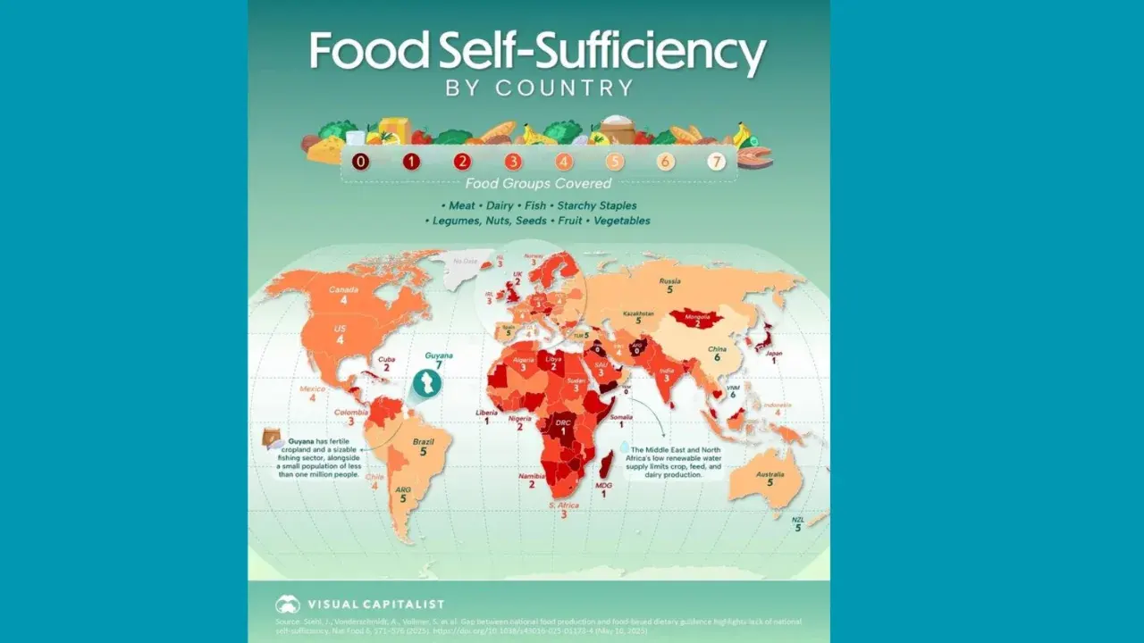 จากการวิเคราะห์ความหลากหลายของสารอาหารที่จำเป็น 7 กลุ่มหลัก ประกอบด้วย แป้ง, ผลไม้, ผัก, ผลิตภัณฑ์นม, เนื้อสัตว์, ปลา และพืชตระกูลถั่ว พบว่า "กายอานา" (Guyana) คือประเทศเดียวที่สามารถผลิตอาหารได้ครบทุกหมวดหมู่ตามความต้องการภายในประเทศ โดยเฉพาะกลุ่มแป้งและผลไม้ที่มีปริมาณล้นเหลือจนสามารถส่งออกได้ ความสำเร็จนี้ทำให้ประเทศขนาดเล็กแห่งนี้กลายเป็นต้นแบบที่แม้แต่มหาอำนาจอย่างสหรัฐอเมริกาหรือจีนยังทำไม่ได้