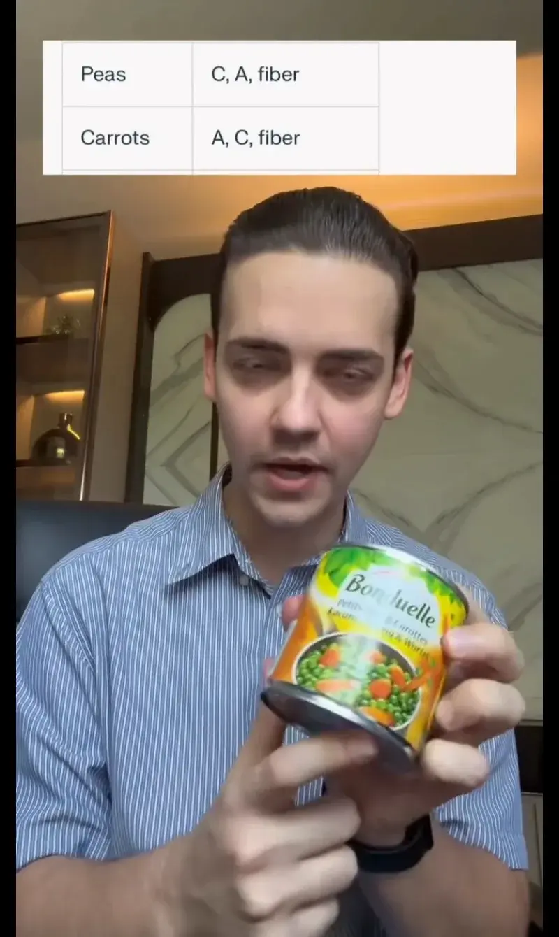 หลายคนตุนแต่ของคาวจนลืมคิดถึงระบบขับถ่าย! ครูเดวิดย้ำเลยว่า "ผักกระป๋อง" อย่างพวกถั่วลันเตาหรือแครอท คือของสำคัญที่ขาดไม่ได้ เพราะอัดแน่นไปด้วย "ไฟเบอร์" วิตามินเอ และวิตามินซี ช่วยรักษาสมดุลร่างกาย ไม่ให้ท้องผูกแม้ในยามที่หาผักสดกินยาก