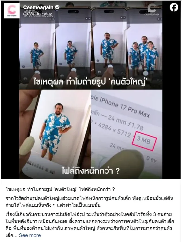 หลังโลกโซเชียลมีการถกเถึยงกันเกี่ยวกับประเด็นภ่ายภาพคนอ้วนแล้วไฟล์ภาพออกมาใหญ่กว่าคนตัวเล็ก และนอกจากนี้ยังมีผู้ใช้ TikTok รายหนึ่งออกมาพิสูจน์แล้วว่าเรื่องนี้เป็นเรื่องจริง คนตัวใหญ่เมื่อถ่ายภาพออกมาแล้วจะใช้ความจำภาพเยอะกว่า อย่างไรก็ตาม ทางเพจดังอย่าง "Ceemeagain" ได้ออกมาไขปริศนาดังกล่าวว่าทำไมเวลาถ่ายรูป ‘คนตัวใหญ่’ ไฟล์ถึงหนักกว่า โดยทางเพจได้ระบุข้อความว่า "จากไวรัลถ่ายรูปคนตัวใหญ่แล้วขนาดไฟล์หนักกว่ารูปคนตัวเล็ก ฟังดูเหมือนมั่วแต่ดันถ่ายได้ไฟล์แบบนั้นจริงๆ แล้วทำไมเป็นแบบนั้น เรื่องนี้เกี่ยวกับกระบวนการบีบอัดไฟล์รูป จะเห็นว่าตัวอย่างในคลิปไวรัลทั้ง 3 คนถ่ายในพื้นหลังสีขาวเหมือนกันหมด ซึ่งความแตกต่างระหว่างภาพคนตัวใหญ่กับคนตัวเล็ก คือ พื้นที่ของตัวคนไม่เท่ากัน ภาพคนตัวใหญ่ ตัวคนจะกินพื้นที่ในภาพมากกว่าคนตัวเล็ก