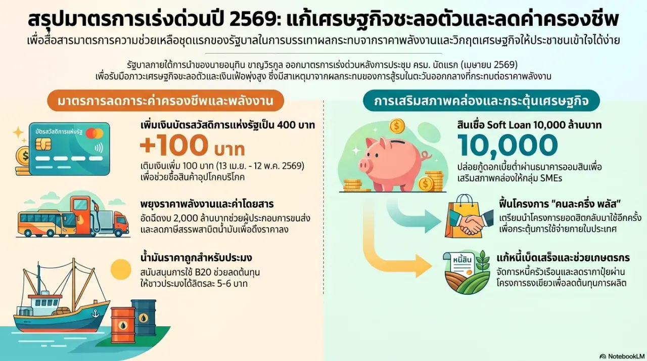 2. กู้ชีพภาคขนส่งด้วยงบ 2,000 ล้าน เพื่อไม่ให้ค่าโดยสารรถเมล์ รถบรรทุก และวินมอเตอร์ไซค์กระโดดขึ้นไปซ้ำเติมคนหาเช้ากินค่ำ รัฐบาลได้สั่งอัดฉีดงบ 2,000 ล้านบาท เพื่อพยุงราคาไว้ นี่คือมาตรการป้องกัน "โดมิโน" ของราคาสินค้าที่จะแพงตามค่าขนส่ง ซึ่งเป็นจุดยุทธศาสตร์สำคัญในการควบคุมเงินเฟ้อ นอกจากนี้ยังมีโครงการ "คนละครึ่ง พลัส" ที่เตรียมกลับมาปัดฝุ่นใหม่เพื่อกระตุ้นการใช้จ่ายในประเทศให้กลับมาคึกคักอีกครั้ง