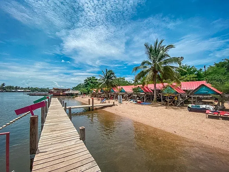 ซึ่งเป็นหาดทรายขาวละเอียดทอดยาวริมแม่น้ำโขงที่มีฉากหลังเป็นแก่งหินสวยงามน้ำที่นี่ใสจนมองเห็นพื้นทรายด้านล่าง ให้บรรยากาศเหมือนอยู่ทะเลน้ำจืดที่สงบและร่มรื่นสุดๆ