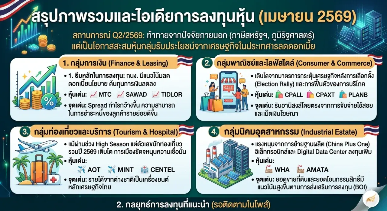 สถานการณ์การลงทุนในไตรมาส 2 ปี 2569 มีความท้าทายจากปัจจัยภายนอก เช่น นโยบายภาษีของสหรัฐฯ และความขัดแย้งทางภูมิรัฐศาสตร์ แต่ในขณะเดียวกันก็เป็นโอกาสในการสะสมหุ้นกลุ่มที่ได้รับประโยชน์จากเศรษฐกิจภายในประเทศและการปรับลดอัตราดอกเบี้ย