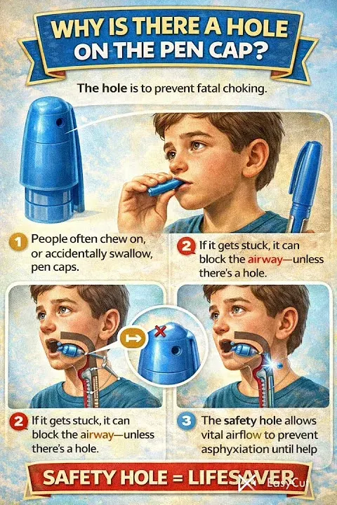 คุณเคยสังเกตไหมว่าบนฝาปากกาลูกลื่นแทบทุกยี่ห้อทั่วโลก จะมีรูเล็กๆ เจาะไว้อยู่ตรงกลางหรือด้านข้าง คนส่วนใหญ่คิดว่ามันคือรูระบายอากาศเพื่อป้องกันหมึกแห้ง หรืออาจคิดว่าเอาไว้ให้หมึกส่วนเกินระบายออก แต่ความจริงแล้วรูเล็กๆ นั้นมีไว้เพื่อช่วยชีวิตคุณซักวันหนึ่ง