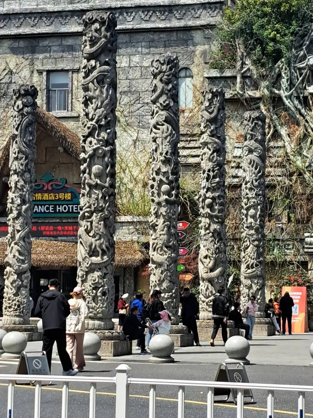 ออกจาก ตม. มาแล้วก็โล่งใจ ทีนี้ก็เดินทางโดยรถบัส ขนาดกลางที่ทางทัวร์จัดไว้ให้ รองรับผู้โดยสารประมาณ 20 คน ได้ไกด์เป็นผู้ชาย (ไกด์จากเมืองไทยก็เป็นผู้ชาย) ไกด์นี่พูดน้ำไหลไฟดับ ระหว่างทางก่อนเวลาอาหารกลางวัน ก็ได้ผ่านสถานที่แห่งหนึ่งเขาบอกว่าเป็นสถานที่จัดการแสดง ภายนอกก็สวยดีค่ะ โดยเฉพาะต้นเสา ที่งดงามสะดุดตา เมื่อถึงที่กินข้าวก็ลงเลยหิวมาก แต่ก็ตามเคย ต้องเดิน เดิน และเดิน จุดนี้เป็นจุดพักของนักท่องเที่ยวค่ะ อาหารอร่อย โดยรอบปลูกต้นไม้เยอะ และมีอาคารใหญ่ล้อมรอบ