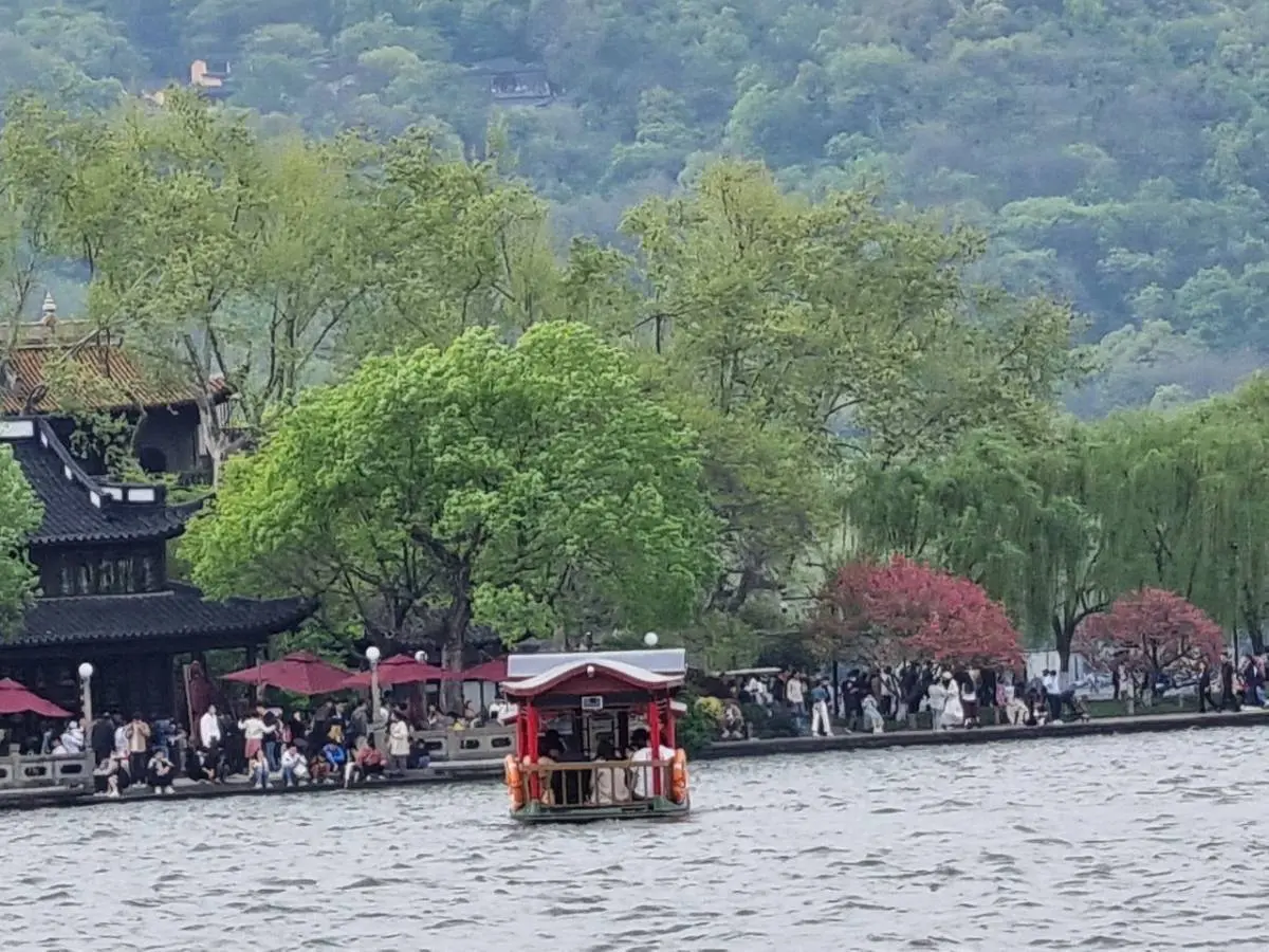 หม่ำแล้วก็มีแรง ไปเที่ยวเลย เขาพาเราไปทะเลสาปซีหู ก็สวยงามระดับหนึ่ง แตน่าเสียดายที่ไปตรงกับวันหยุดของประเทศเขา คนเลยเยอะมาก เอ่อ เอาเป็นว่านับหมื่น สถานที่กว้างขวางสุดหู สุดตา กลายเป็นแคบลงอย่างถนัดใจ การเดินทางมาที่นี่ รถของนักท่องเที่ยวต้องจอดรอข้างนอก และนั่งรถของทางการเข้าไปค่ะ คนเยอะ แย่งกัน อารมณ์เหมือนแย่งขึ้นรถเมล์ที่บ้านเราเลย ระหว่างทางที่รถแล่นผ่าน ก็ไปได้ไม่เร็วค่ะ เพราะบนท้องถนน และ 2 ข้างทาง เต็มไปด้วยคนเดิน และคนขี่จักรยาน หลังจากที่รถทางการมาส่งแล้ว เราต้องเดินต่อเข้าไปที่บริเวณทะเลสาปนะคะ เดินไกลพอสมควร อันที่จริงแล้ว ถ้าจะเดินเที่ยวที่นี่ คงต้องไปฝึกเดินมาราธอนมาก่อนค่ะ เพราะกว้างใหญ่มาก ตัวทะเลสาปเองก็ใหญ่นะคะ เสียดายที่ไม่ได้ไปโดยรอบ ได้ล่องเรืออย่างเดียวแล้วก็กลับค่ะ