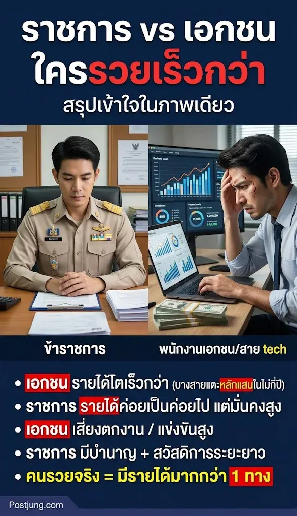 เพราะไม่ว่าจะราชการหรือเอกชน ถ้ามีทักษะ วินัย และรู้จักต่อยอด เช่น ลงทุน ทำธุรกิจ หรือสร้างรายได้เสริม ก็สามารถสร้างความมั่งคั่งได้ทั้งคู่