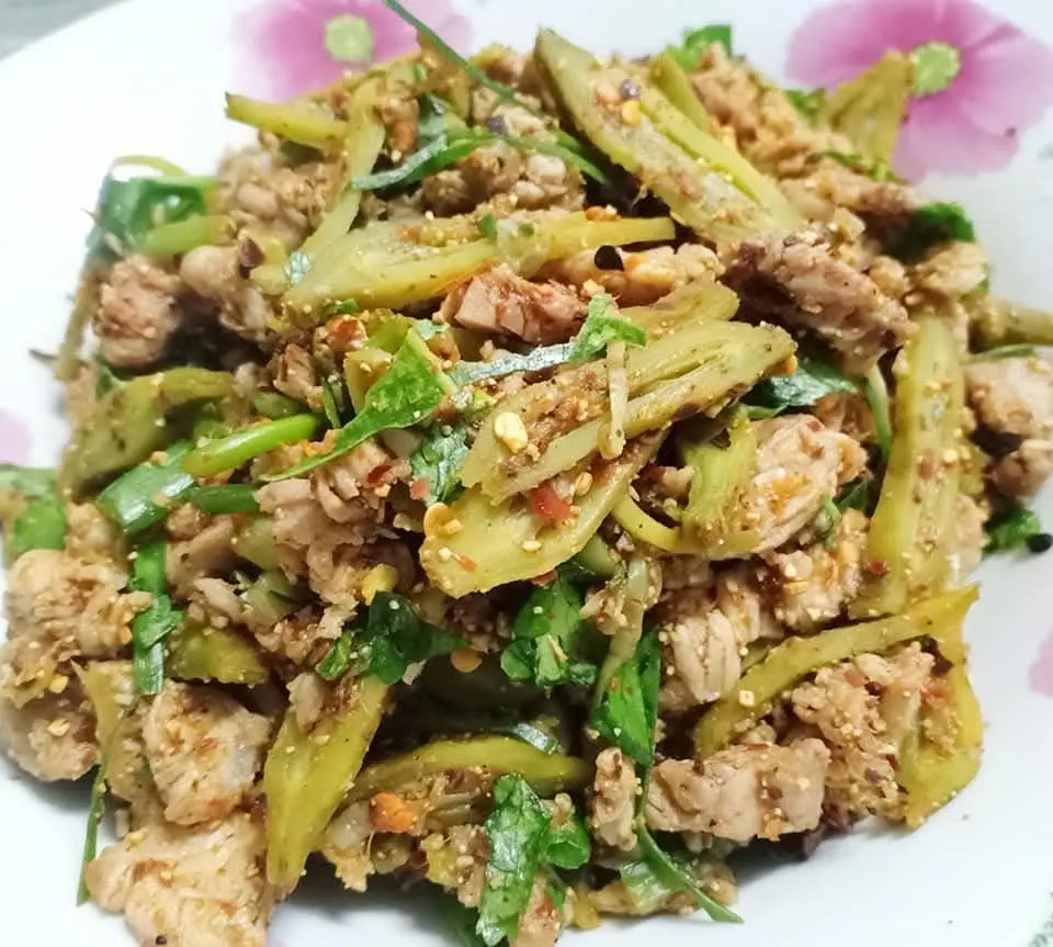มาที่เมนูขมแต่ดีต่อสุขภาพอย่าง ก้อยลิ้นฟ้า หรือ ยำเพกา ฝักเพกาหรือลิ้นฟ้ามีลักษณะยาวเรียวดูแปลกตา หลายคนอาจไม่คิดว่านี่คือของกิน