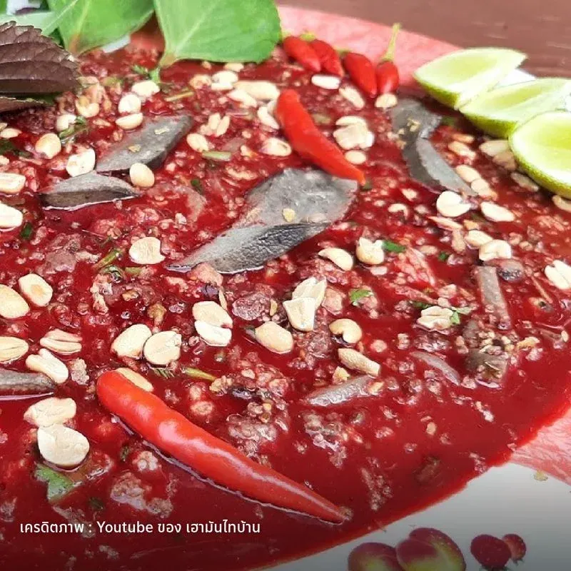 เมนูนี้ของทางภาคเหนือที่จะนำเลือดหมู ที่ทิ้งไว้จนเป็นลิ่ม มาใส่เครื่องปรุง ในสมุนไพรเครื่องเทศดับคาว ก่อนจะกินแบบดิบๆ เมนูนี้ส่วนตัวไม่เคยกิน ไม่กล้า แต่สอบถามคนที่ชอบทานเขาบอกว่ามันจะรสชาติหวานๆ นัวๆจากเครื่องปรุง