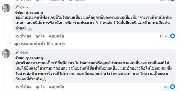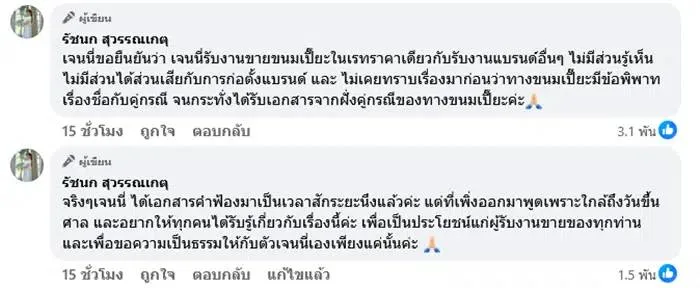 เธอยังระบุอีกว่า ตนเองเป็นเพียง “ผู้รับจ้างรีวิวสินค้า” เท่านั้น ไม่มีส่วนเกี่ยวข้องกับการก่อตั้งแบรนด์ หรือข้อพิพาทใด ๆ