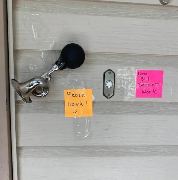 2. กริ่งประตูบ้านฉันเสียเมื่อประมาณสัปดาห์ที่แล้ว เราเลยต้องแก้ปัญหาเฉพาะหน้าด้วยการใช้แตรแทน