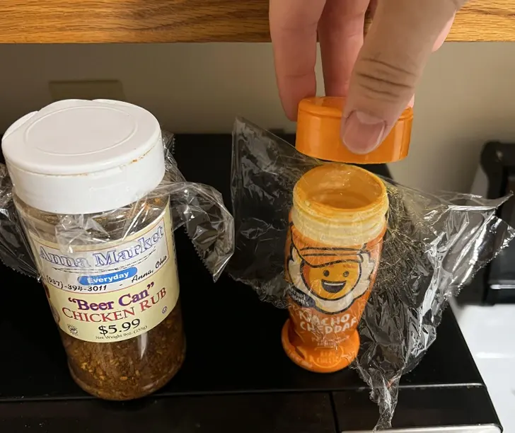 11. ฉันใช้แผ่นพลาสติกห่ออาหารรองใต้ฝาเพื่อปิดผนึกเครื่องปรุงรสเพื่อป้องกันไม่ให้แข็งตัวเมื่อเวลาผ่านไป