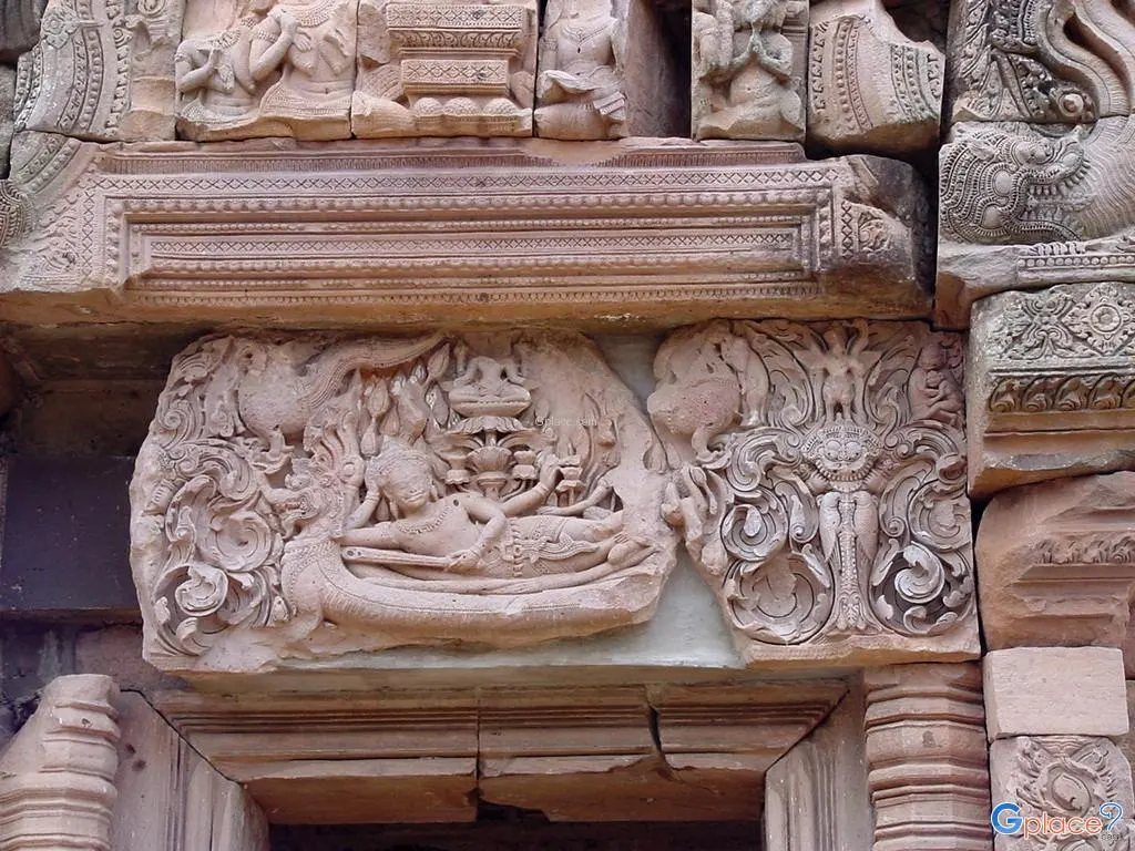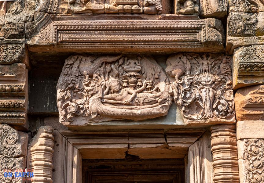 ท่ามกลางความยิ่งใหญ่ของปรางค์ประธาน มีโบราณวัตถุชิ้นหนึ่งที่ผู้คนแทบทุกคนตั้งใจมองหาเมื่อมาถึงพนมรุ้ง นั่นคือ ทับหลังนารายณ์บรรทมสินธุ์ ทับหลังที่ได้รับการกล่าวถึงมากที่สุดของปราสาทแห่งนี้ ความงามของงานสลักไม่ได้อยู่เพียงที่ความประณีตของเส้นสาย หากแต่อยู่ในเรื่องราวที่ถูกเล่าไว้บนแผ่นหินอย่างอ่อนช้อยและทรงพลัง ภาพพระนารายณ์เอนกายเหนือพญาอนันตนาคราช กลางองค์มีดอกบัวผุดจากพระนาภี และมีพระพรหมประทับอยู่บนดอกบัว ส่วนปลายพระบาทมีพระลักษมีประทับอยู่ด้วย ภาพทั้งหมดทำให้ทับหลังชิ้นนี้มีทั้งมิติทางศิลปะและความหมายเชิงจักรวาลวิทยาในคติฮินดูอย่างลึกซึ้ง