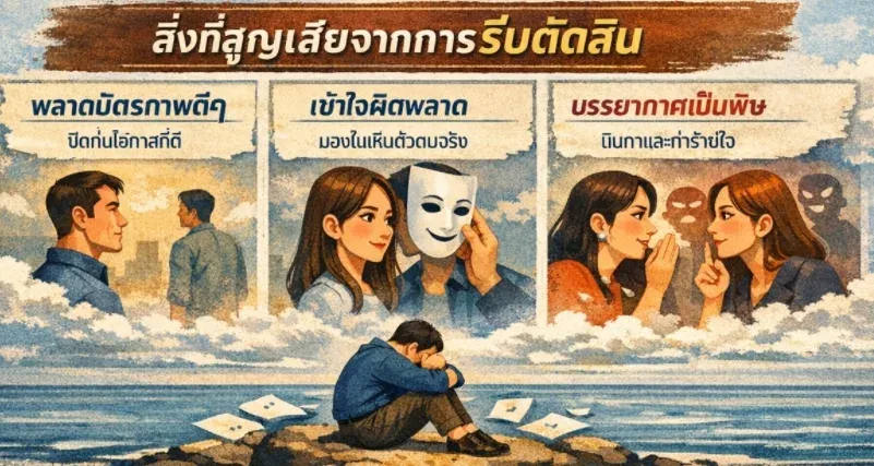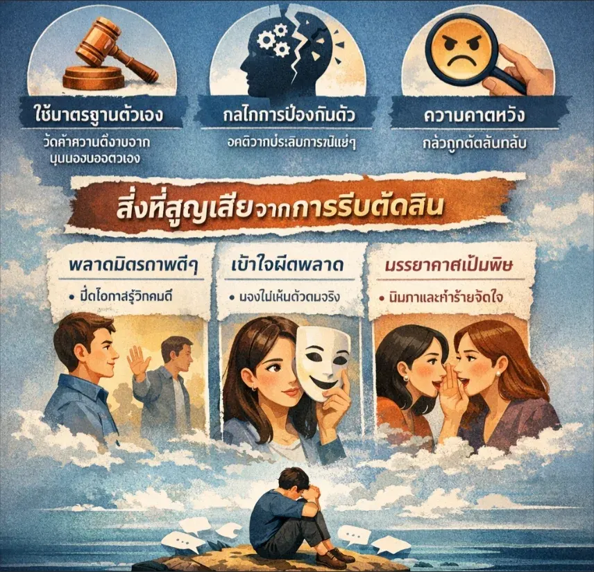 จำไว้ว่าคำตัดสินของคนอื่นคือ "ความคิดเห็น" (Opinion) ของเขา ซึ่งปรุงแต่งมาจากอคติและประสบการณ์ส่วนตัวของเขาเอง มันไม่ใช่ "ความจริง" (Fact) ของตัวคุณครับ