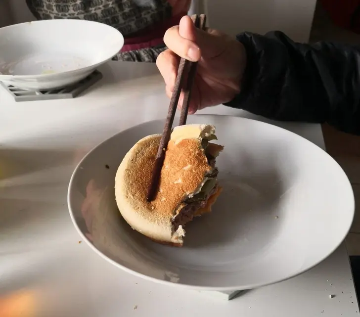 11. นี่เป็นวิธีที่พ่อของผมกินเบอร์เกอร์โดยคว่ำด้านหนึ่งลง และใช้ตะเกียบ