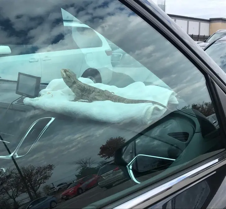 12. รถที่จอดข้าง ๆ รถของผมมีจิ้งก่านอนอย่างสบายอารมณ์อยู่บนแผงหน้าปัดด้วย