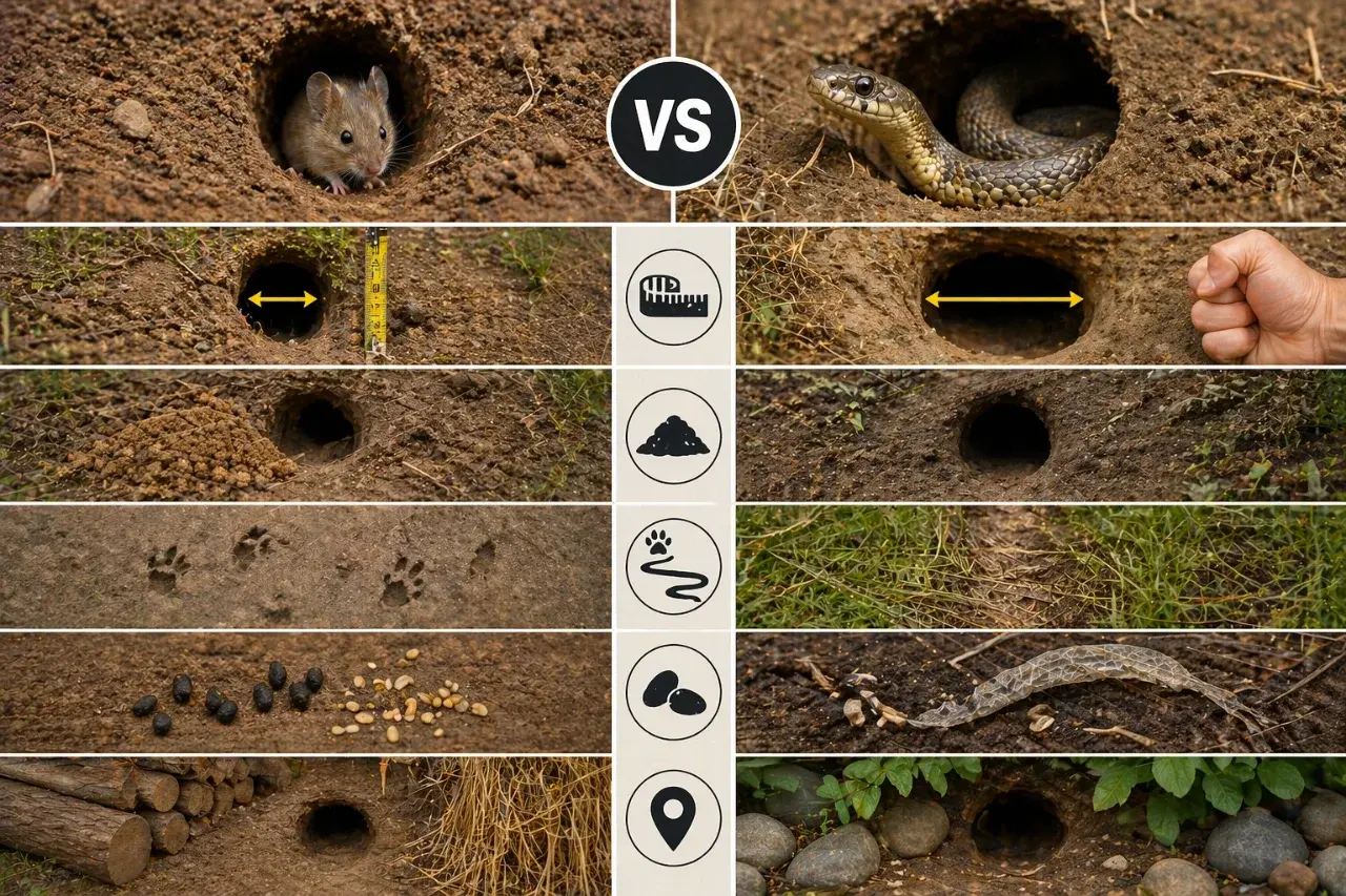 ตำแหน่งของรูก็สำคัญไม่แพ้กัน รูหนูมักอยู่ใกล้แหล่งอาหาร ถังขยะ กองของเก่า อาหารสัตว์ หรือบริเวณที่มีเศษอาหารตกค้าง ส่วนรูที่งูอาจใช้หลบซ่อนมักอยู่ในที่สงบ รก ทึบ และมีที่กำบัง เช่น ใต้พุ่มไม้ ใต้กองหิน ข้างกำแพง หรือมุมสวนที่คนไม่ค่อยเดินผ่าน หน่วยงานด้านการจัดการสัตว์รบกวนอย่าง ICWDM ยังแนะนำว่า การลดหนูและแหล่งอาศัยของหนูเป็นส่วนสำคัญในการลดปัญหางูรอบบ้าน เพราะงูจำนวนมากตามอาหารเข้ามา
