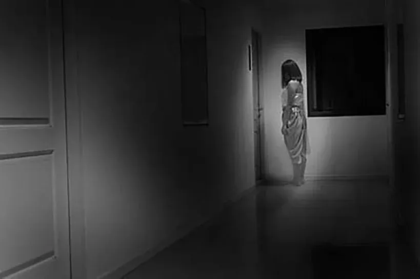 นนท์รีบลุกออกไปเปิดประตู โดยที่ข้างในยังมืดสนิท แล้ว…มีเงาหนึ่งยืนอยู่ที่หน้ากระจก เป็นผู้หญิง ผมยาวรุงรัง เสื้อผ้าดำไหม้เกรียม ผิวหนังบางส่วนลอกออกเหมือนถูกไฟเผามา