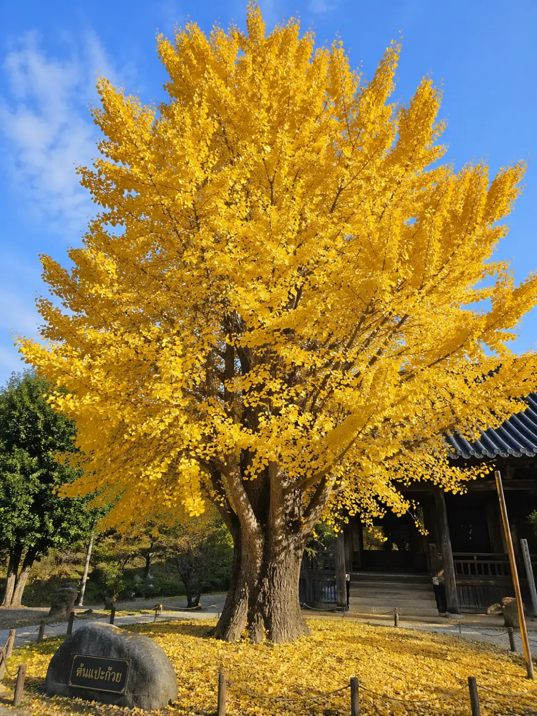 - ใบมีรูปทรงพัด สีเขียว และจะเปลี่ยนเป็นสีเหลืองทองในฤดูใบไม้ร่วง