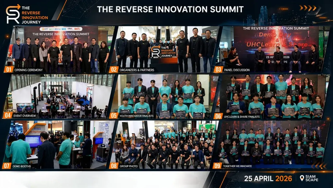 ในงาน The Reverse Innovation Summit นักวิจัยและสตาร์ทอัพทั้ง 12 ทีมได้นำเสนอผลงานต่อคณะกรรมการและแขกผู้มีเกียรติ โดย 6 ทีมที่โดดเด่นที่สุดในการนำนวัตกรรมไปพัฒนาต่อยอดร่วมกับภาคอุตสาหกรรมจนเกิดผลลัพธ์เป็นรูปธรรม ได้รับโล่รางวัล "Distinguished Innovation Team" จาก สอวช. สจล. และพันธมิตรบริษัทขนาดใหญ่ นอกจากนี้ ยังมีสัมมนาพิเศษจาก Ms. Sonia Ng ผู้ก่อตั้งสตาร์ทอัพจากประเทศมาเลเซีย ที่จะแบ่งปันประสบการณ์จริงด้านการสร้างสตาร์ทอัพและการระดมทุนในระดับสากล รวมถึงการเสวนาพิเศษ เพื่อแลกเปลี่ยนประสบการณ์การเรียนรู้เกี่ยวกับความร่วมมือระหว่างบริษัทขนาดใหญ่และสตาร์ทอัพ โดยมีมหาวิทยาลัยเป็นตัวกลาง มีผู้ร่วมเสวนาเป็นตัวแทนจากภาคส่วนสำคัญที่เกี่ยวข้อง ได้แก่ นางสาวมนันยา ชุณหวุฒิยานนท์ ผู้อำนวยการฝ่ายอาวุโส ฝ่ายนโยบายนวัตกรรมเพื่อพัฒนาผู้ประกอบการ สอวช. น.สพ.ดร.สนัด วงศ์ทวีทอง' ผู้จัดการกองทุน TED Fund นายจิระภัทร์ เยาว์วัชสกุล ผู้อำนวยการสถาบันนวัตกรรมและบ่มเพาะธุรกิจ บริษัท บางจาก คอร์ปอเรชั่น จำกัด (มหาชน) นายโกวินทร์ กุลฤชากร ประธานเจ้าหน้าที่บริหารฝ่ายนวัตกรรม เซ็นทรัล รีเทล ดิจิทัล และนายกิติพงศ์ มุตตามระ ผู้ช่วยกรรมการผู้จัดการใหญ่ ธนาคารกรุงไทย ดำเนินการเสวนาโดยผศ. ดร.รัชนี กุลยานนท์ รองอธิการบดีฝ่ายนวัตกรรมและความร่วมมือระหว่างประเทศ สจล. และดร.อภิวัฒน์ ทองประเสริฐ กรรมการผู้จัดการ บริษัท วิสอัพ จำกัด