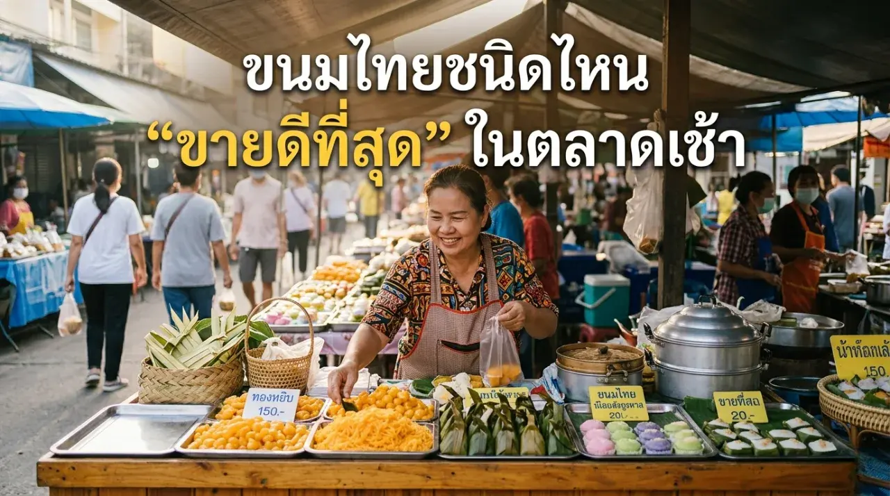 ถ้าต้องเลือกเพียงคำตอบเดียว ขนมไทยที่มีโอกาสขายดีที่สุดในตลาดเช้าน่าจะเป็น กลุ่มข้าวเหนียวหน้าต่าง ๆ มากกว่าขนมชนิดเดียวแบบตายตัว เพราะมันยืนอยู่กึ่งกลางระหว่างของหวานกับอาหารเช้า กินแล้วอิ่ม ถือเดินได้ และราคาไม่ทำให้คนลังเล รองลงมาคือขนมครก ขนมถ้วย ขนมใส่ไส้ ขนมกล้วย และขนมต้ม ซึ่งขายดีในแบบของตัวเองตามพื้นที่และกลุ่มลูกค้า
