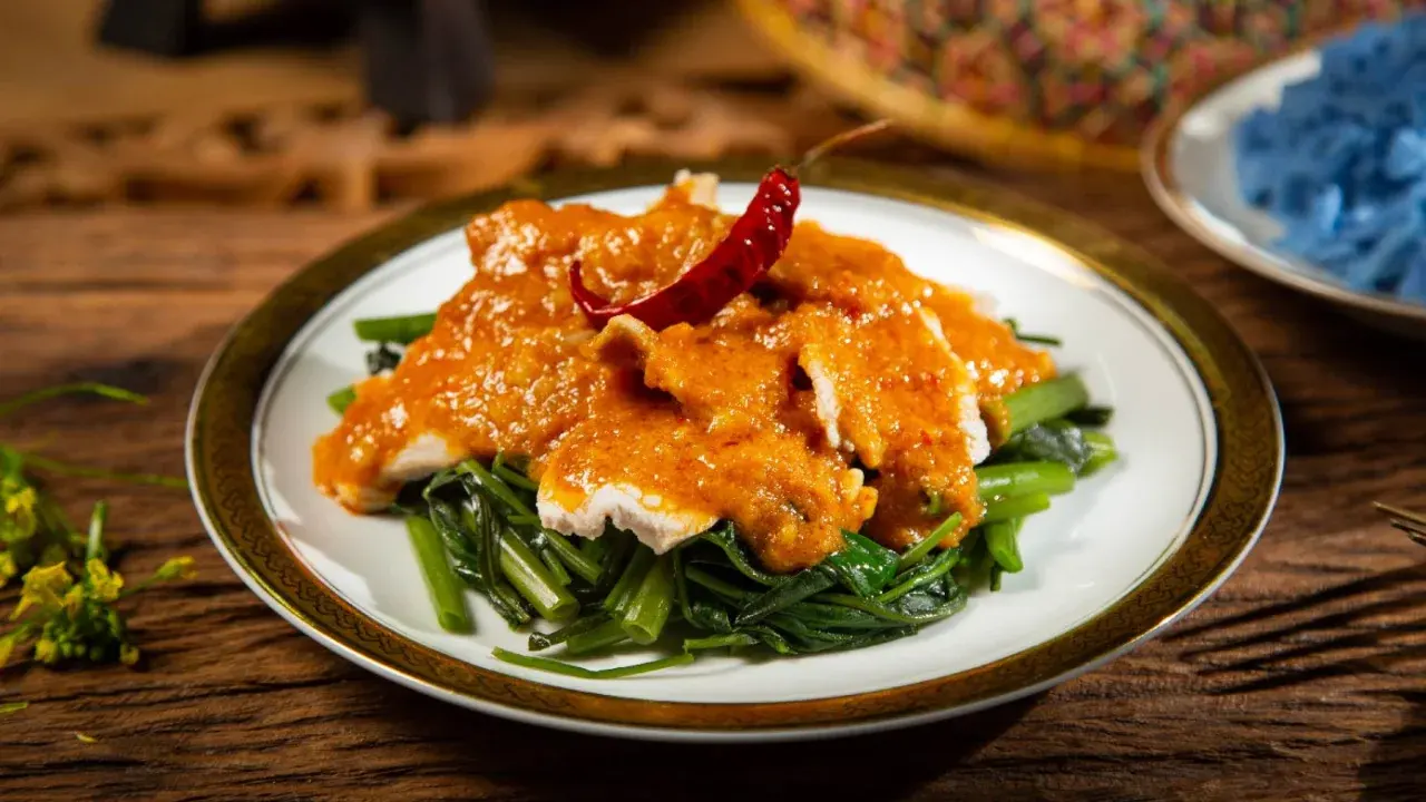 องค์ประกอบทางวัฒนธรรมในหนึ่งจาน: พระรามลงสรงเป็นตัวแทนของการประนีประนอมทางรสชาติ โดยใช้ ผักบุ้ง (ผักท้องถิ่นที่หาได้ง่าย) หมู (เนื้อสัตว์หลักของชาวจีน) และ น้ำราดสะเต๊ะ (เครื่องเทศอิทธิพลมุสลิม) ทานคู่กับ น้ำพริกเผา และ พริกชี้ฟ้าหั่น เพื่อตัดเลี่ยนตามรสนิยมคนไทย