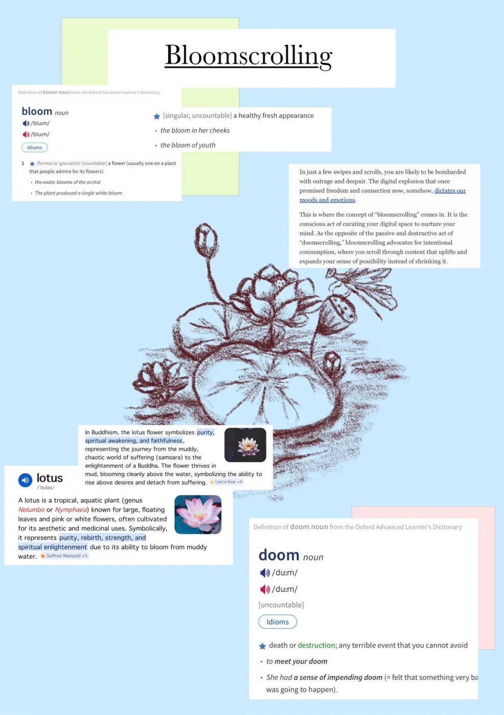 เราเป็นคนหนึ่งที่มีพฤติกรรมเสพติดสื่อ ใช้เวลาส่วนใหญ่ไปกับการไถฟีด จนช่วงหลัง ๆ เริ่มสังเกตได้ว่าตัวเองไม่สามารถจดจ่อกับสิ่งใดได้นานเหมือนเดิม ความคิดสร้างสรรค์ค่อย ๆ ลดลง เพราะเสพสื่อเพียงสิ่งที่ชอบจากการที่อัลกอริทึมป้อนข้อมูลให้ และจากที่มีความสุขกับการทำอะไรบางสิ่งก็เริ่มหายไปด้วย เราจึงตัดสินใจที่จะพยายามดึงตัวเองกลับมาอีกครั้ง เราได้รู้จักกับแนวคิดที่เป็นเหมือนด้านตรงข้ามของ doomscrolling นั่นคือ 🪷bloomscrolling🪷โดย Oxford Learner’s Dictionaries อธิบายคำว่า bloom ว่า ‘a flower (usually one on a plant that people admire for its flowers)’ หมายถึง ดอกไม้ที่ผู้คนนิยมชื่นชมในความงดงาม และอีกความหมายหนึ่งคือ ‘a healthy fresh appearance’ ซึ่งสื่อถึงความเปล่งปลั่ง สดใส และมีสุขภาพดี นอกจากนี้ Mansha Roy ยังให้ความหมายว่า ‘Bloomscrolling isn’t just another productivity hack. It’s philosophy. A gentle rebellion against the mindless consumption of content that clutters your thoughts, triggers insecurities, and silently reshapes your worldview. 'It’s the intentional act of curating what enters your mind — the digital equivalent of choosing the flowers in your garden. Only here, your garden is your mind, and each post, video, or article is a seed.’ แปลได้ว่า Bloomscrolling ไม่ใช่แค่เทคนิคเพิ่มประสิทธิภาพอีกอย่างหนึ่ง แต่มันคือ “ปรัชญา” เป็นการต่อต้านอย่างแผ่วเบาต่อการเสพคอนเทนต์แบบไร้สติ ที่ทำให้ความคิดของเรารกรุงรัง กระตุ้นความไม่มั่นใจ และค่อย ๆ เปลี่ยนมุมมองต่อโลกของเราโดยที่เราไม่รู้ตัว มันคือการตั้งใจคัดเลือกสิ่งที่จะปล่อยให้เข้ามาในจิตใจ เปรียบเสมือนการเลือกดอกไม้ในสวนของคุณ เพียงแต่สวนในที่นี้คือ จิตใจของคุณ และทุกโพสต์ วิดีโอ หรือบทความ ก็คือเมล็ดพันธุ์แต่ละเมล็ด