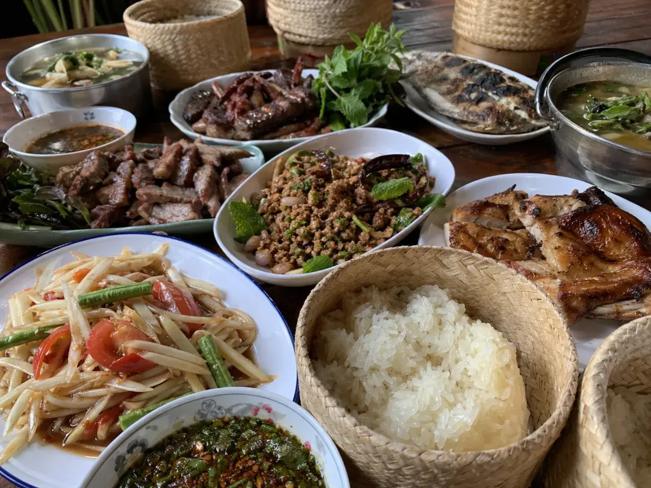 ฝั่งเมนูย่าง ไก่ย่างกับคอหมูย่างคือคู่คลาสสิกที่เห็นได้ตั้งแต่ร้านริมทางไปจนถึงร้านอาหารใหญ่ กลิ่นควัน ความมันจากเนื้อ และรสน้ำจิ้มแจ่ว พอรวมกับข้าวเหนียวร้อน ๆ จะกลายเป็นคำที่มีทั้งความหอม ความนัว และความอิ่มแบบพอดี โดยเฉพาะคอหมูย่างที่มีมันแทรกนิด ๆ ข้าวเหนียวช่วยรับความมันและทำให้รสจัดของน้ำจิ้มพอดีขึ้น