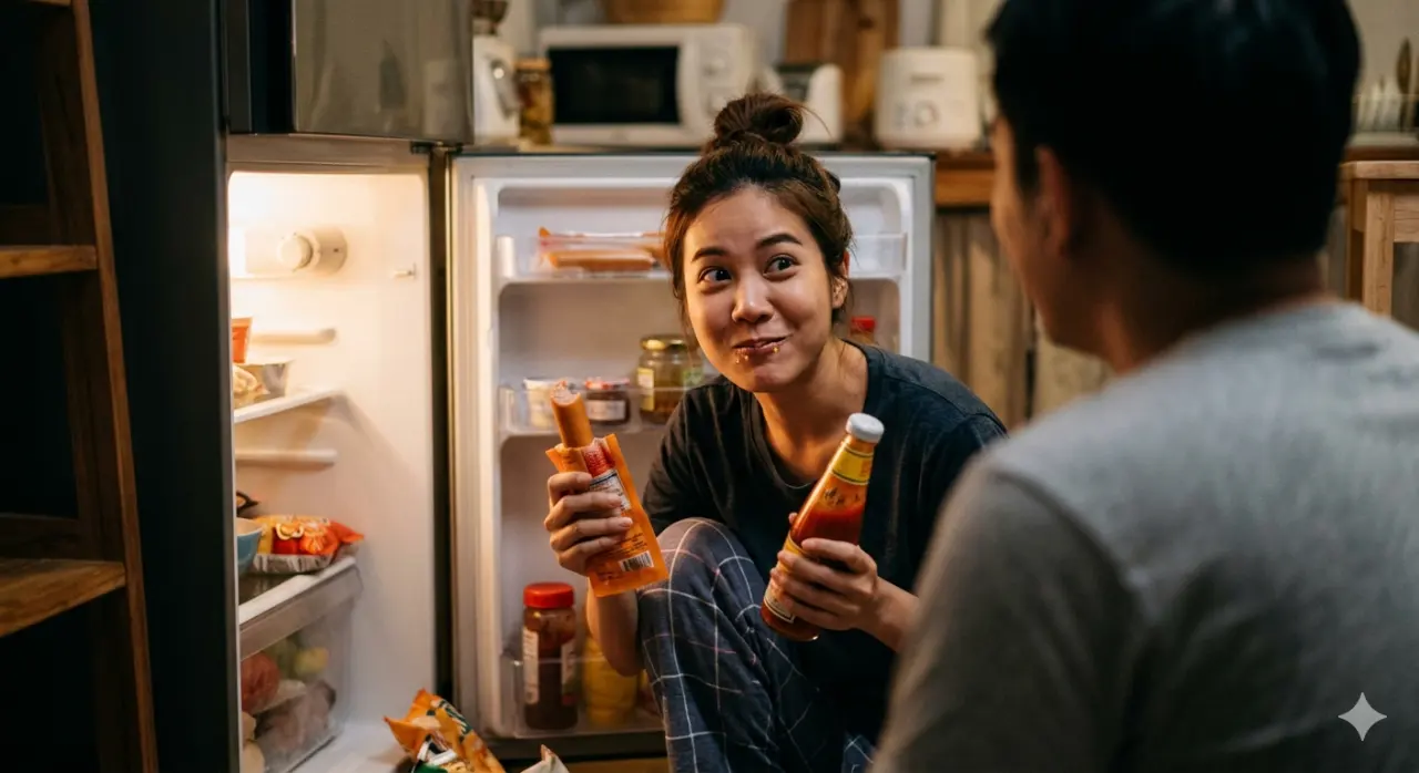 ความพีคขั้นสุดคือตอนห้าทุ่มครับ ผมกำลังจะหลับ แต่อยู่ดีๆ ก็ได้ยินเสียง ก๊อกแก๊กๆ ดังมาจากในครัว ผมเลยย่องไปดู ภาพที่เห็นคือ... แฟนผมนั่งยองๆ อยู่หน้าตู้เย็น ในมือซ้ายถือขวดซอสพริก มือขวาถือไส้กรอกที่ยังไม่ได้เวฟ!